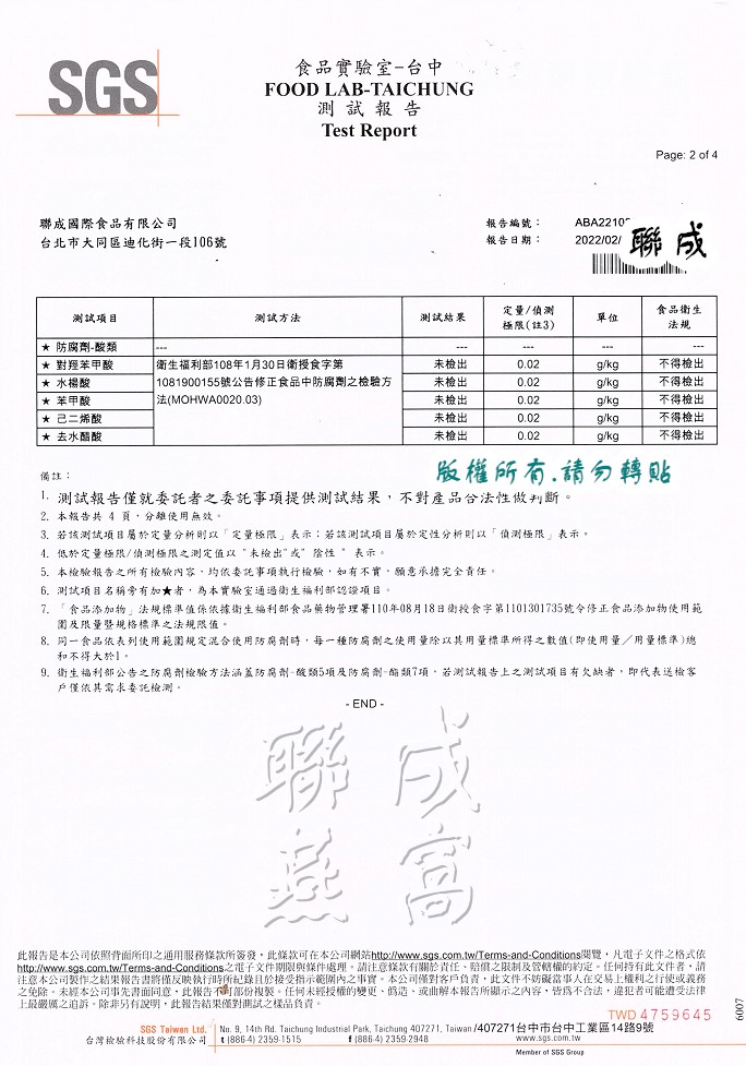 聯成燕窩SGS檢驗測試結果報告 (防腐劑未檢出) 對羥基苯甲酸 --- 測試結果:未檢出 水楊酸 --- 測試結果:未檢出 苯甲酸 --- 測試結果:未檢出 己二烯酸 --- 測試結果:未檢出 去水醋酸 --- 測試結果:未檢出